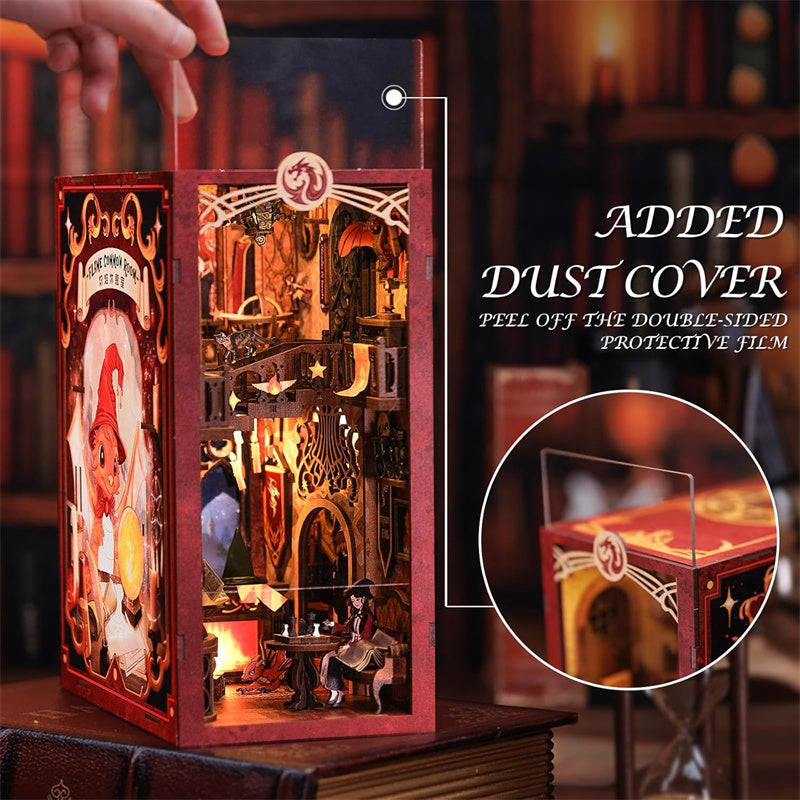 The Book Corner Bookshelf Model is a DIY book corner project, and a beautiful collection and decoration. It has a set of LED lights. After assembling this book corner kit, turn on the lights and the hut will light up, making the book corner kit more interesting and attractive. It can decorate your desktop, bookshelf, and room.